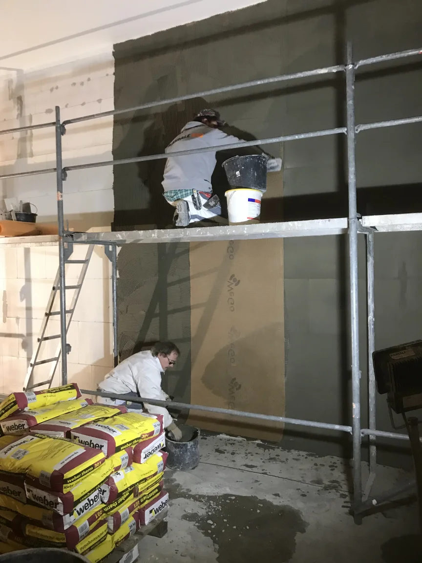 Akzentwand als Besenstrich mit KEIM Turado herstellen und 2.000 m² mit KEIM Innostar/Ecosil und Innotop beschichten. Klinker-Windfang im Außen mit KEIM Concretal-Lasur beschichten.