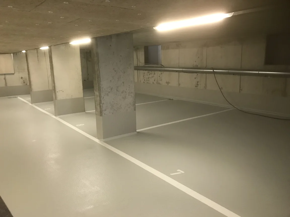 Betonflächen in einem Mehrfamilienhaus mit Ardex B12 glätten und mit KEIM Concretal-Lasur in Betonoptik lasieren. Circa 3.000 m² Malervlies kleben und dispersionsbeschichten. Ausführung einer OS8-Beschichtung in der Tiefgarage.