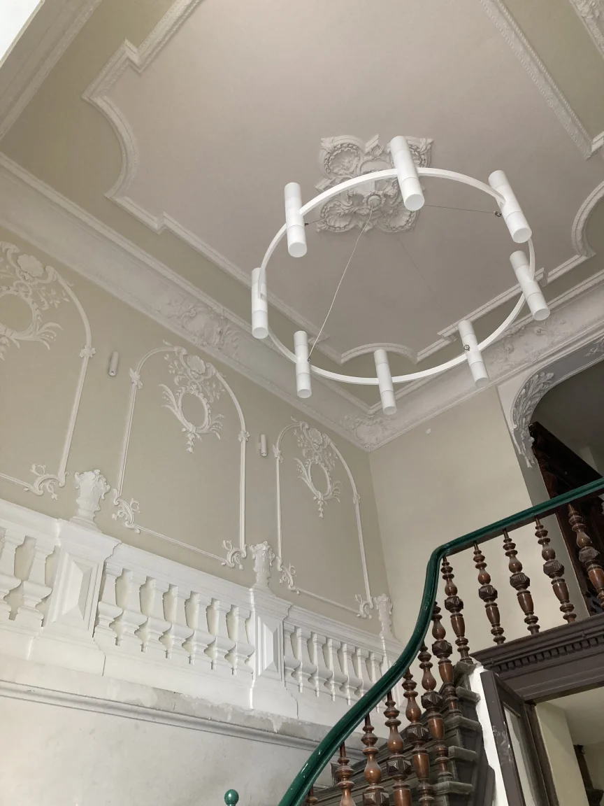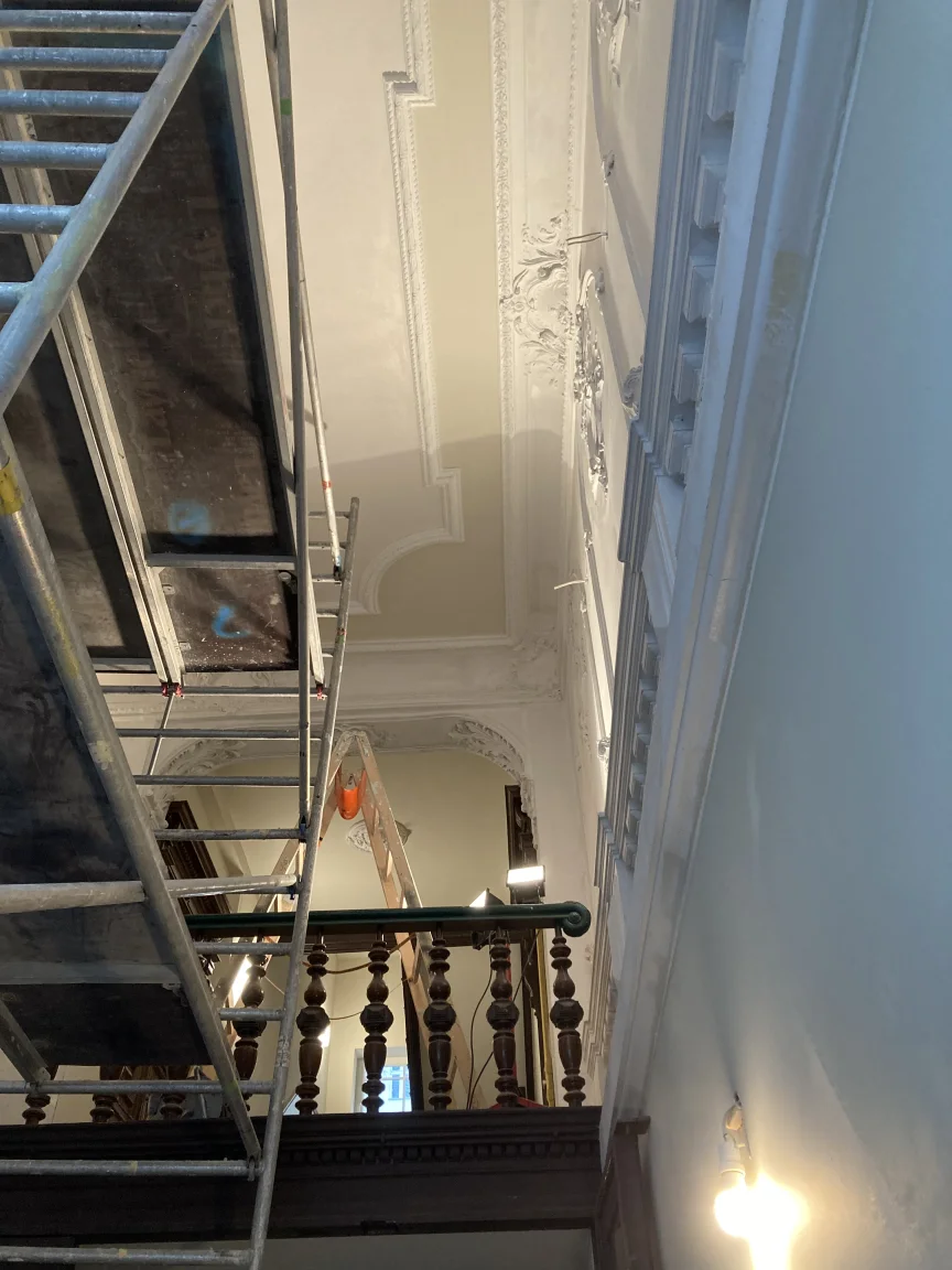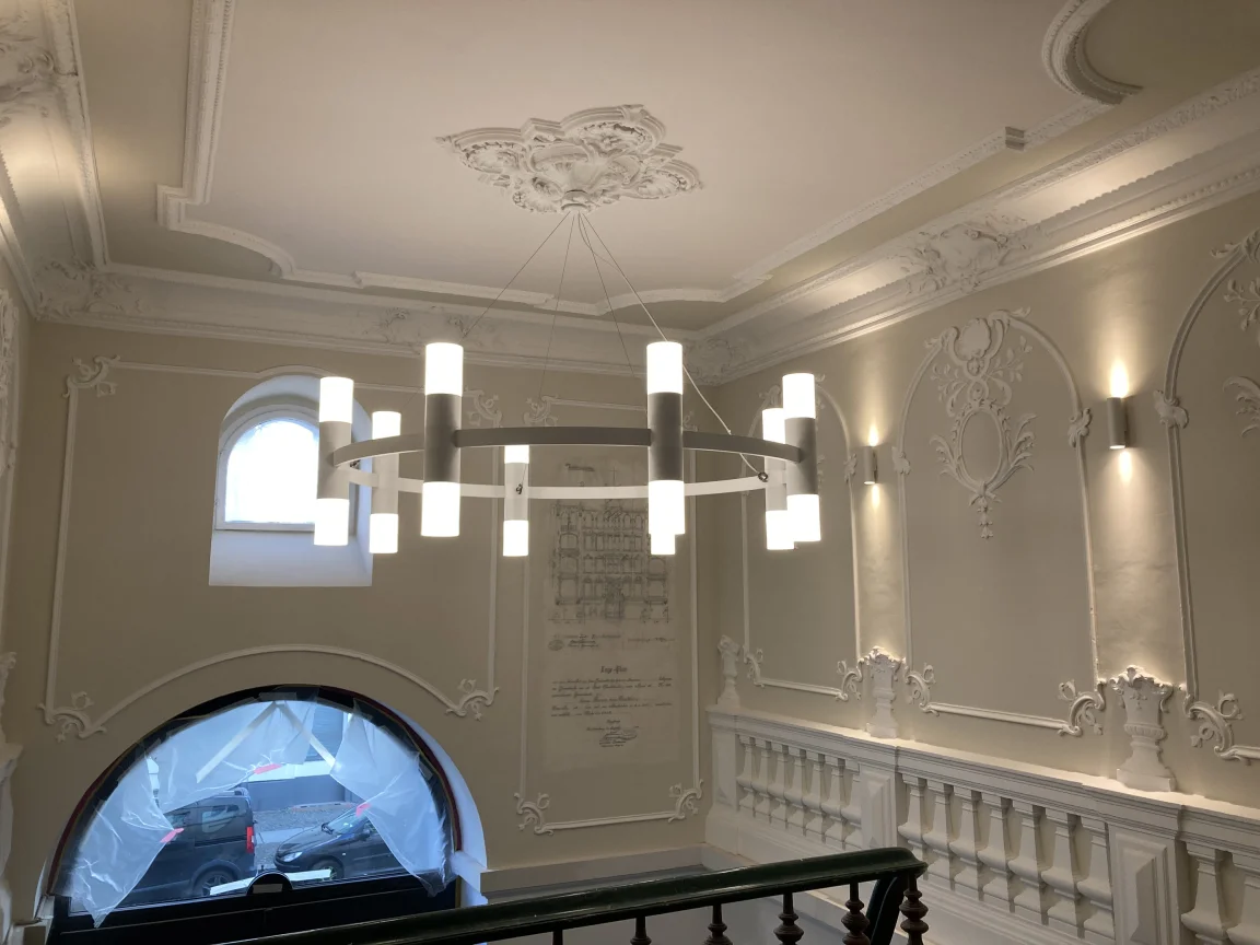 Farbige Umgestaltung der Treppenhäuser sowie des historischen Eingangsfoyers nach Farrow & Ball- Farbkonzept. Applikation von Schmuckleisten mit Stuck.
