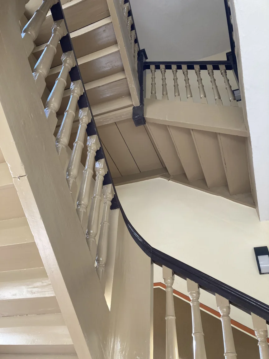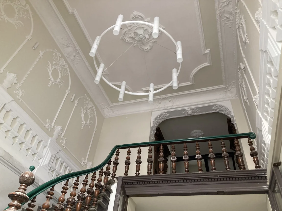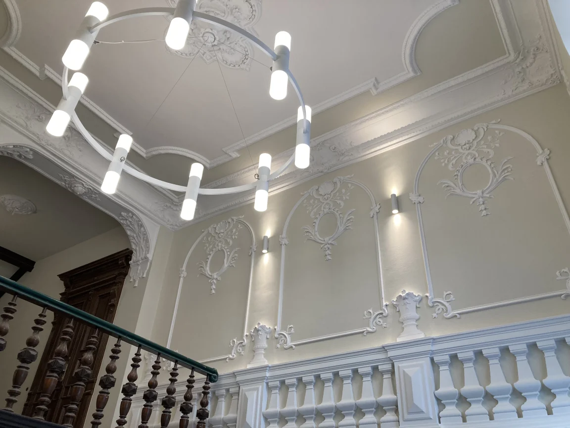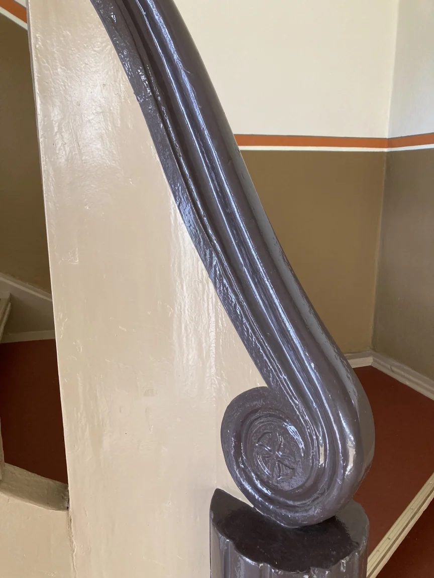 Farbige Umgestaltung der Treppenhäuser sowie des historischen Eingangsfoyers nach Farrow & Ball- Farbkonzept. Applikation von Schmuckleisten mit Stuck.