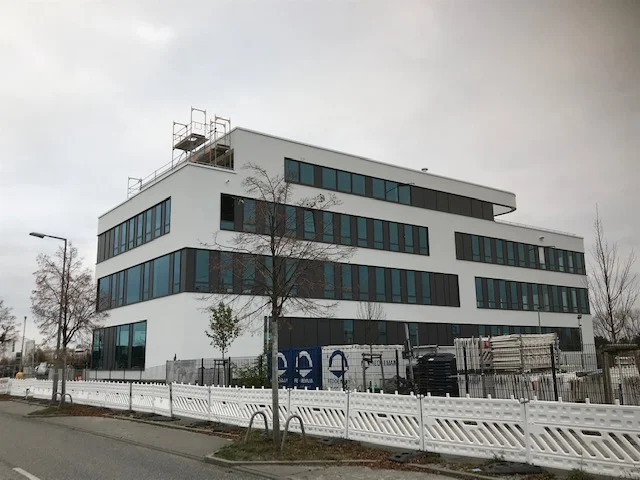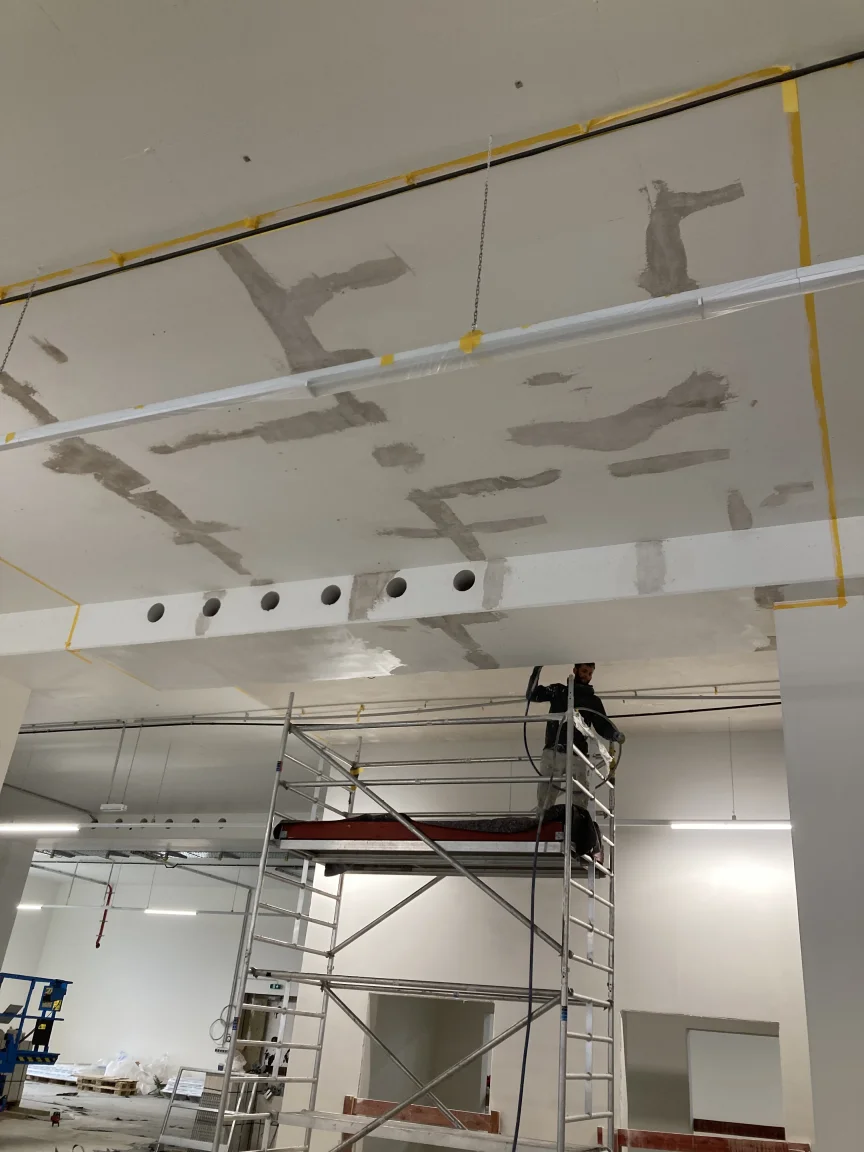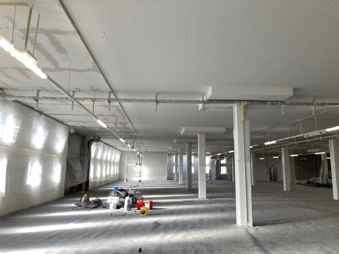 Bürogebäude-Neubau am Groß-Berliner Damm: Circa 2.000 m² vollflächig spachteln und Glasfaservlies kleben, ca. 4.000 m² beschichten.