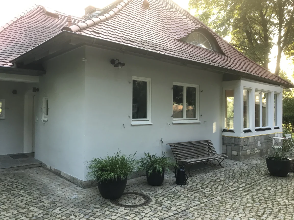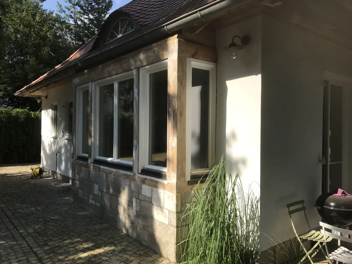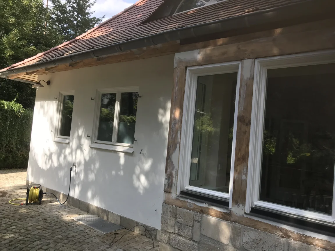 Fassade mit KEIM Soldalit für Einfamilienhaus in Babelsberg. Holzgebälk und Dachüberstand mit Owatrol.