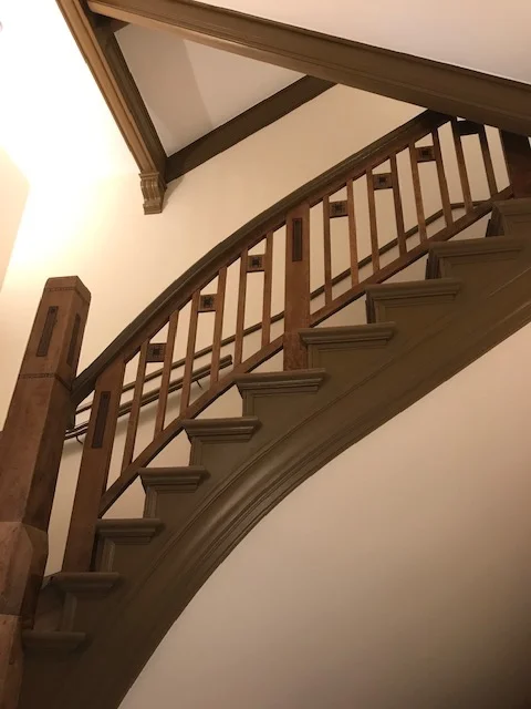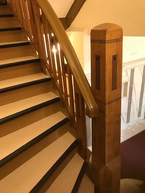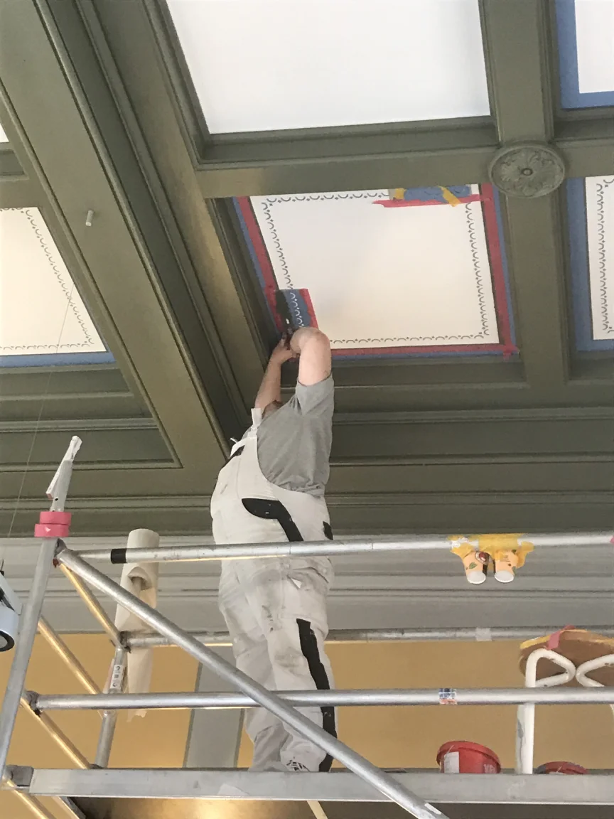 Neugestaltung des Haupttreppenhauses: Maler- und Bodenbelagsarbeiten, Spachteln der Decken und Wandflächen sowie Freilegen der Holzintarsien.